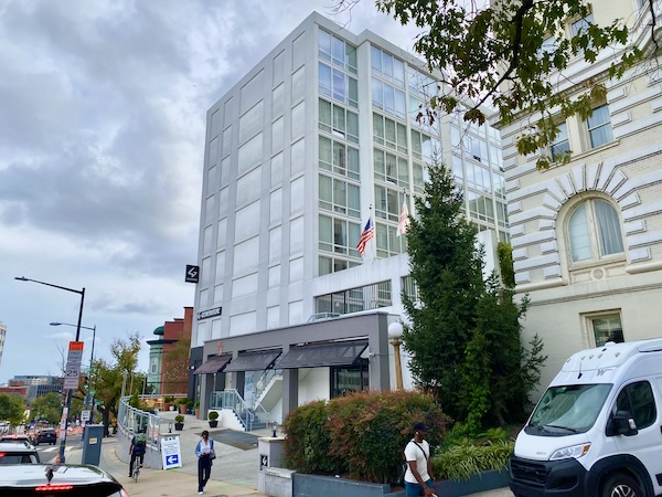 Mid-rise modernist hotel one block west of "Dupont Circle" metro in the heart of Washington, DC. On Massachusetts Avenue where Embassy Row begins. 231 compact guest rooms. Relaxing rooftop terrace with pool and bar (May thru September). Restaurant, fitness center. 5 meeting rooms. $60 valet parking. $100 pet fee. (Tribute Portfolio hotel)